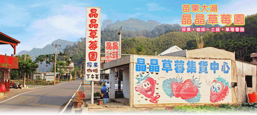 晶晶草莓園非常漂亮且種植面積一公頃,過雪霸國家公園往泰安延途這家最漂亮,草莓實在是夠大,園區分成十二生肖區,每一區豎起一個生肖的大牌子,遠遠就看得到。門口還有賣花式茶飲及咖啡,草莓香腸等,環境很好,現烤的草莓香腸,吃起來肉很軟,帶酒香與草莓香,肉咬起來很軟。